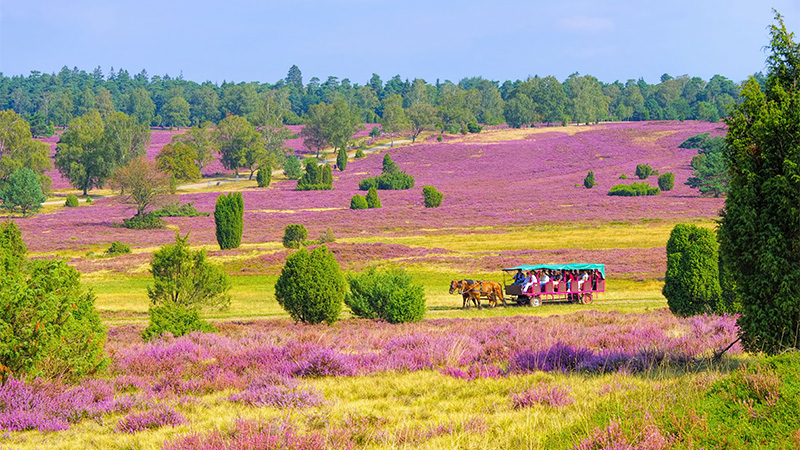 Endast några få mil söder om Hamburg ligger ”Lüneburger Heide” (Lüneburgsheden). Ett berömt och omtyckt hedområde med sin speciella natur bestående av sandmarker, enbuskar, vackra skogar, pittoreska byar och småstäder. Vi besöker Celle, besöker sparrisodlare och färdas på denna resa inte bara med buss utan även med häst och vagn på heden.